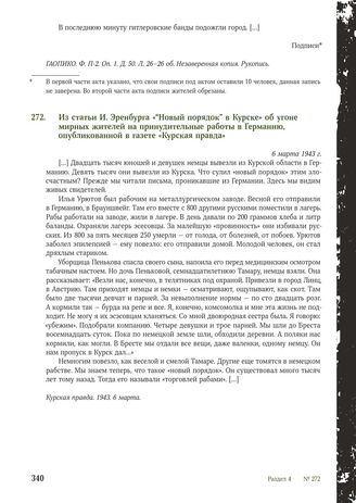 Из статьи И. Эренбурга ««Новый порядок» в Курске» об угоне мирных жителей на принудительные работы в Германию, опубликованной в газете «Курская правда». 6 марта 1943 г. // Курская правда. 1943. 6 марта.