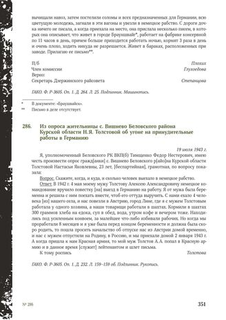Из опроса жительницы с. Вишнево Беловского района Курской области Н.Я. Толстовой об угоне на принудительные работы в Германию. 19 июля 1943 г. // ГАКО. Ф. P-3605. Оп. 1. Д. 232. Л. 159-159 об. Подлинник. Рукопись.