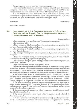 Из опросного листа А. А. Думанской, уроженки с. Бобровского Рыльского района Курской области, возвратившейся на родину с принудительных работ в Германии. 29 января 1945 г. // ГАКО. Ф. P-3605. Оп. 1. Д. 284. Л. 99-100 об. Подлинник. Рукопись.
