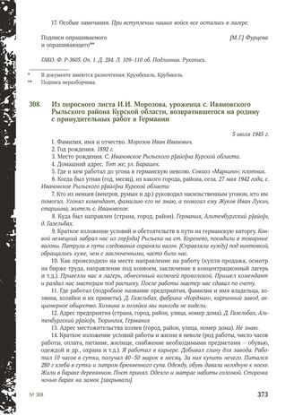 Из опросного листа И.И. Морозова, уроженца с. Ивановского Рыльского района Курской области, возвратившегося на родину с принудительных работ в Германии. 5 июля 1945 г. // ГАКО. Ф. P-3605. Оп. 1. Д. 284. Л. 115-116 об. Подлинник. Рукопись.