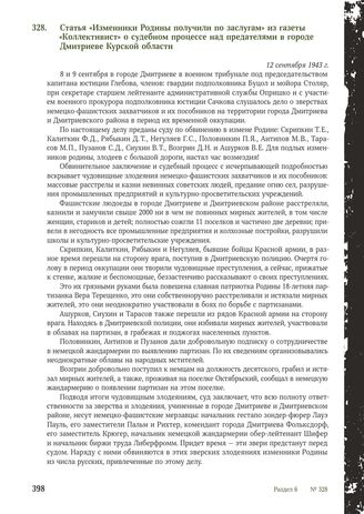 Статья «Изменники Родины получили по заслугам» из газеты «Коллективист» о судебном процессе над предателями в городе Дмитриеве Курской области. 12 сентября 1943 г. // Коллективист. 1943. 12 сент.
