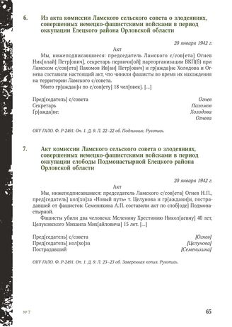 Из акта комиссии Ламского сельского совета о злодеяниях, совершенных немецко-фашистскими войсками в период оккупации Елецкого района Орловской области. 20 января 1942 г. // ОКУ ГАЛО. Ф. P-2491. Оп. 1. Д. 9. Л. 22-22 об. Подлинник. Рукопись.