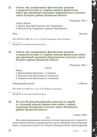 Из акта Волынской районной комиссии по ущербу от злодеяний немецко-фашистских войск в период оккупации Волынского сельского совета Волынского района Орловской области. 1 марта 1942 г. // ОКУ ГАЛО. Ф. P-2491. Оп. 1. Д. 5. Л. 45-45 об. Заверенная копия. Рукопись.