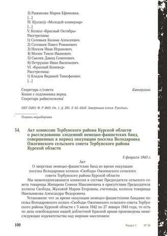 Акт комиссии Тербунского района Курской области о расследовании злодеяний немецко-фашистских банд, совершенных в период оккупации поселка Володаровка Ожогинского сельского совета Тербунского района Курской области. 5 февраля 1943 г. // ОКУ ГАКО. Ф. P-3605. Оп. 1. Д. 293. Л. 26. Копия. Рукопись.