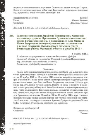 Заявление гражданки Аграфены Никифоровны Фирсовой, жительницы деревни Лукьяновки Лукьяновского сельского совета Волынского района, о повешении ее сына Фирсова Ивана Андреевича немецко-фашистскими захватчиками в период оккупации Лукьяновского сельского совета Волынского района Орловской области в декабре 1941 г. 6 декабря 1944 г. // ОКУ ГАЛО. Ф. P-2491. Оп. 1. Д. 16. Л. 67-67 об. Подлинник. Рукопись.
