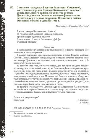 Заявление гражданки Варвары Яковлевны Сомониной, жительницы деревни Языково Квитковского сельского совета Волынского района, об убийстве ее мужа Данила Андреевича Сомонина немецко-фашистскими захватчиками в период оккупации Волынского района Орловской области в декабре 1941 г. 26 октября - 8 декабря 1944 года // ОКУ ГАЛО. Ф. Р-2491. Оп. 1. Д. 16. Л. 31-31 об. Подлинник. Рукопись.