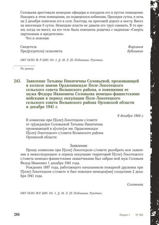 Заявление Татьяны Никитичны Соловьевой, проживающей в колхозе имени Орджоникидзе Поле-Локотецкого сельского совета Волынского района, о повешении ее мужа Федора Ивановича Соловьева немецко-фашистскими войсками в период оккупации Поле-Локотецкого сельского совета Волынского района Орловской области в декабре 1941 г. 8 декабря 1944 г. // ОКУ ГАЛО. Ф. Р-2491. Оп. 1. Д. 16. Л. 23. Подлинник. Рукопись.