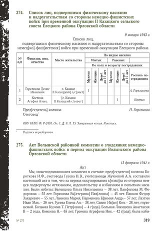 Список лиц, подвергшихся физическому насилию и надругательствам со стороны немецко-фашистских войск при временной оккупации II Казацкого сельского совета Елецкого района Орловской области. 9 января 1943 г. // ОКУ ГАЛО. Ф. P-2491. Оп. 1. Д. 9. Л. 15. Заверенная копия. Рукопись.