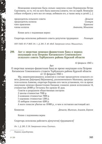 Акт о зверствах немецко-фашистских банд в период оккупации села Петрово Китаевского Семеновского сельского совета Тербунского района Курской области. 12 февраля 1943 г. // Оп. 1. Д. 293. Л. 50. Заверенная копия. Рукопись.