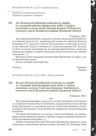 Из акта Волынской районной комиссии по ущербу от злодеяний немецко-фашистских войск в период оккупации колхоза «Советская Коммуна» Ключинского сельского совета Волынского района Орловской области. 10 февраля 1942 г. // ОКУ ГАЛО. Ф. P-2491. Оп. 1. Д. 5. Л. 55-55 об. Копия. Рукопись.