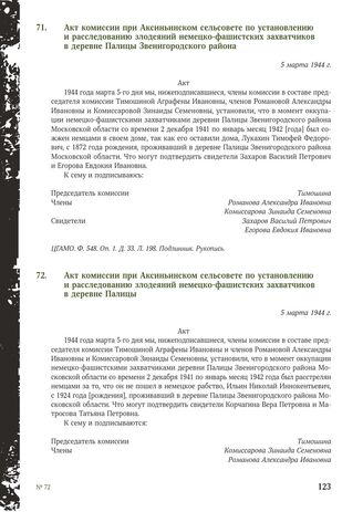 Акт комиссии при Аксиньинском сельсовете по установлению и расследованию злодеяний немецко-фашистских захватчиков в деревне Палицы. 5 марта 1944 г. // ЦГАМО. Ф. 548. Оп. 1. Д. 33. Л. 199. Подлинник. Рукопись.