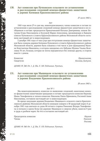 Акт комиссии при Мышицком сельсовете по установлению и расследованию злодеяний немецко-фашистских захватчиков в деревне Владычино Краснополянского района. 28 июля 1943 г. // ЦГАМО. Ф. 548. Оп. 1. Д. 33а. Л. 133. Подлинник. Рукопись.