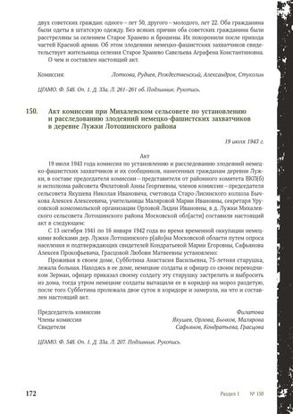 Акт комиссии при Михалевском сельсовете по установлению и расследованию злодеяний немецко-фашистских захватчиков в деревне Лужки Лотошинского района. 19 июля 1943 г. [1] // ЦГАМО. Ф. 548. Оп. 1. Д. 33а. Л. 207. Подлинник. Рукопись.