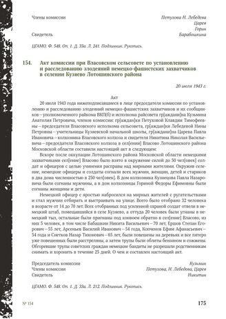 Акт комиссии при Власовском сельсовете по установлению и расследованию злодеяний немецко-фашистских захватчиков в селении Кузяево Лотошинского района. 20 июля 1943 г. // ЦГАМО. Ф. 548. Оп. 1. Д. 33а. Л. 212. Подлинник. Рукопись.