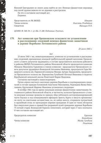 Акт комиссии при Орешковском сельсовете по установлению и расследованию злодеяний немецко-фашистских захватчиков в деревне Воробьево Лотошинского района. 23 июля 1943 г. // ЦГАМО. Ф. 548. Оп. 1. Д. 33а. Л. 191-191 об. Подлинник. Рукопись.