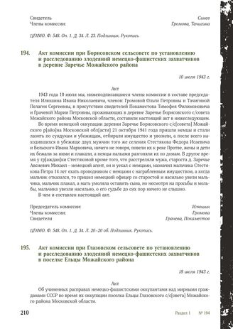 Акт комиссии при Борисовском сельсовете по установлению и расследованию злодеяний немецко-фашистских захватчиков в деревне Заречье Можайского района. 10 июля 1943 г. // ЦГАМО. Ф. 548. Оп. 1. Д. 34. Л. 20-20 об. Подлинник. Рукопись.