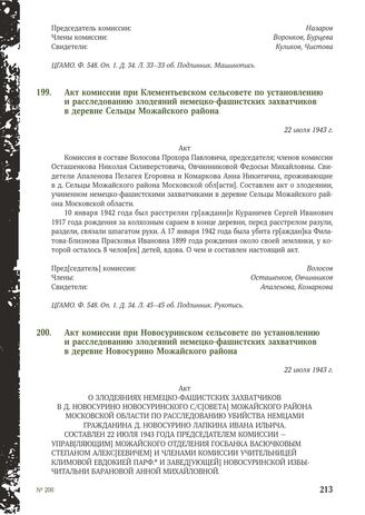 Акт комиссии при Новосуринском сельсовете по установлению и расследованию злодеяний немецко-фашистских захватчиков в деревне Новосурино Можайского района. 22 июля 1943 г. // ЦГАМО. Ф. 548. Оп. 1. Д. 34. Л. 30. Подлинник. Машинопись.
