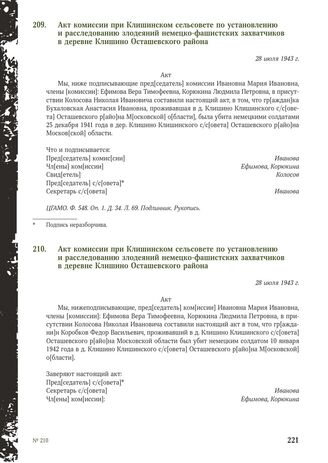 Акт комиссии при Клишинском сельсовете по установлению и расследованию злодеяний немецко-фашистских захватчиков в деревне Клишино Осташевского района. 28 июля 1943 г. [1] // ЦГАМО. Ф. 548. Оп. 1. Д. 34. Л. 69. Подлинник. Рукопись.