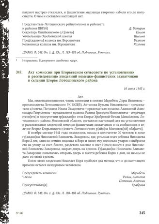 Акт комиссии при Егорьевском сельсовете по установлению и расследованию злодеяний немецко-фашистских захватчиков в селении Егорье Лотошинского района. 16 июля 1943 г. // ЦГАМО. Ф. 548. Оп. 1. Д. 33а. Л. 188-188 об. Подлинник. Рукопись.