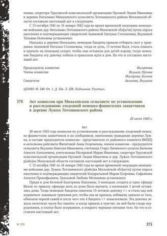 Акт комиссии при Михалевском сельсовете по установлению и расследованию злодеяний немецко-фашистских захватчиков в деревне Лужки Лотошинского района. 20 июля 1943 г. // ЦГАМО. Ф. 548. Оп. 1. Д. 33а. Л. 222-222 об. Подлинник. Рукопись.