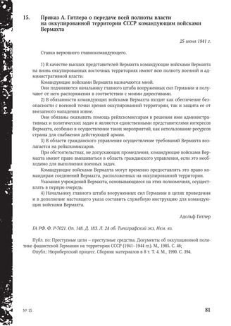 Приказ А. Гитлера о передаче всей полноты власти на оккупированной территории СССР командующим войсками Вермахта. 25 июня 1941 г. // ГА РФ. Ф. P-7021. Оп. 148. Д. 183. Л. 24 об. Типографский экз. Нем. яз. Публ. по: Преступные цели — преступные средства. Документы об оккупационной политике фашистской Германии на территории СССР (1941-1944 гг.). М., 1985. С. 46; Опубл.: Нюрнбергский процесс. Сборник материалов в 8 т. Т. 4. М., 1990. С. 394.