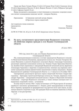 Из акта, составленного представителями Водинского сельсовета, об убийствах мирных граждан в селе Водино Сталинградской области. 23 июня 1943 г. // ГА РФ. Ф. P-7021. Оп. 45. Д. 3. Л. 7-8 об. Заверенная копия. Рукопись.
