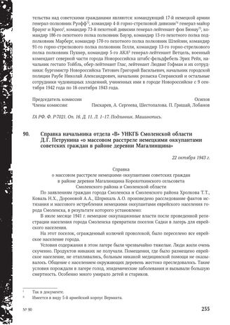 Справка начальника отдела «В» УНКГБ Смоленской области Д. Г. Петрунина «о массовом расстреле немецкими оккупантами советских граждан в районе деревни Магалинщина». 22 октября 1943 г. // ЦА ФСБ России. Ф. К-72. Оп. 1. Д. 25. Л. 105 -107. Копия. Машинопись.