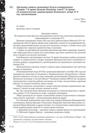 Докладная записка начальника Отдела контрразведки «Смерш» 7-й армии Исакова Военному совету 7-й армии об издевательствах администрации Ильинского лагеря № 8 над заключенными. 4 июля 1944 г. // ГА РФ. Ф. P-7021. Оп. 95. Д. 317. Л. 1-7. Заверенная копия. Машинопись.