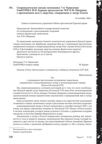 Сопроводительное письмо начальника 7-го Управления ГлавПУРККА М.И. Бурцева председателю ЧГК Н.М. Швернику с приложением акта о зверствах, совершенных в лагере Клоога. 10 октября 1944 г. // ГА РФ. Ф. P-7021. Оп. 97. Д. 882. Л. 25. Подлинник. Машинопись; Л. 26-28. Копия. Машинопись.