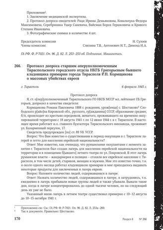 Протокол допроса старшим оперуполномоченным Тираспольского городского отдела НКГБ Григорьевым бывшего кладовщика примарии города Тирасполя Р.П. Кормщикова о массовых убийствах евреев. г. Тирасполь, 6 февраля 1945 г.