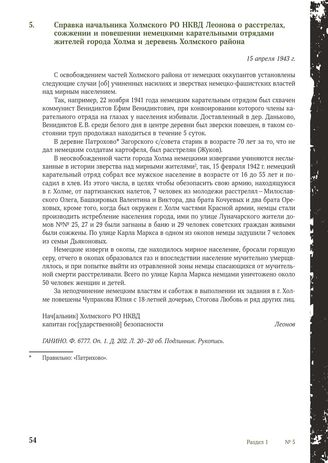 Справка начальника Холмского РО НКВД Леонова о расстрелах, сожжении и повешении немецкими карательными отрядами жителей города Холма и деревень Холмского района. 15 апреля 1943 г.