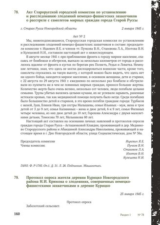 Акт Старорусской городской комиссии по установлению и расследованию злодеяний немецко-фашистских захватчиков о расстреле с самолетов мирных граждан города Старой Руссы. Г. Старая Русса Новгородской области, 2 января 1945 г. // ГАНО. Ф. Р-1793. Оп.1. Д. 31. Л. 26. Подлинник. Машинопись.