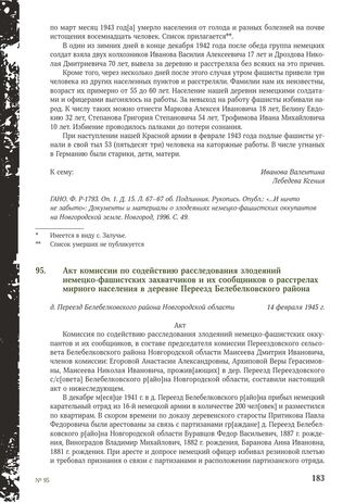 Акт комиссии по содействию расследования злодеяний немецко-фашистских захватчиков и их сообщников о расстрелах мирного населения в деревне Переезд Белебелковского района. д. Переезд Белебелковского района Новгородской области, 14 февраля 1945 г. // ГАНО. Ф. P-1793. Оп. 1. Д. 6. Л. 142-144 об. Подлинник. Рукопись.