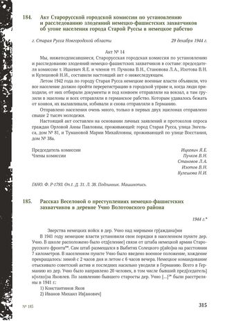 Акт Старорусской городской комиссии по установлению и расследованию злодеяний немецко-фашистских захватчиков об угоне населения города Старой Руссы в немецкое рабство. г. Старая Русса Новгородской области, 29 декабря 1944 г. // ГАНО. Ф. Р-1793. Оп. 1. Д. 31. Л. 38. Подлинник. Машинопись.