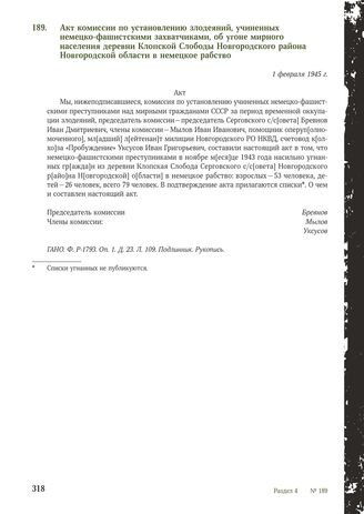 Акт комиссии по установлению злодеяний, учиненных немецко-фашистскими захватчиками, об угоне мирного населения деревни Клопской Слободы Новгородского района Новгородской области в немецкое рабство. 1 февраля 1945 г. // ГАНО. Ф. P-1793. Оп. 1.Д. 23. Л. 109. Подлинник. Рукопись.