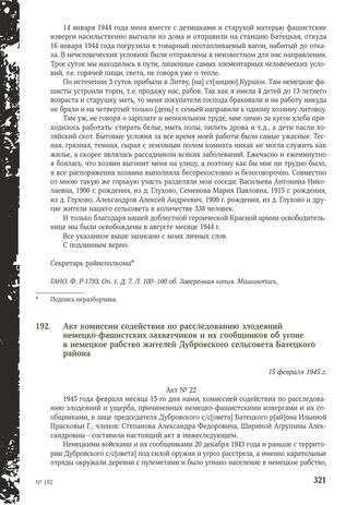 Акт комиссии содействия по расследованию злодеяний немецко-фашистских захватчиков и их сообщников об угоне в немецкое рабство жителей Дубровского сельсовета Батецкого района. 15 февраля 1945 г. // ГАНО. Ф. P-1793. Оп. 1. Д. 7. Л. 105. Заверенная копия. Машинопись.
