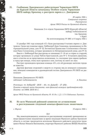Сообщение Дмитровского райотделения Управления НКГБ по Курской области начальнику Особого отдела Управления НКГБ майору Кремлеву о расстреле евреев в г. Дмитровске. 20 марта 1944 г.