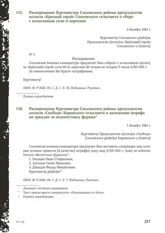 Распоряжение бургомистра Сосковского района председателю колхоза «Красный герой» Сосковского сельсовета о сборе с колхозников соли и керосина. 3 декабря 1941 г. // ГАОО. Ф. P-1645. Оп. 1. Д. 1. Л. 16. Подлинник. Рукопись.