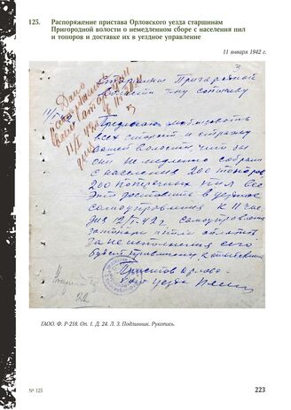 Распоряжение пристава Орловского уезда старшинам Пригородной волости о немедленном сборе с населения пил и топоров и доставке их в уездное управление. 11 января 1942 г. // ГАОО. Ф. Р-218. Оп.1. Д. 24. Л. 3. Подлинник. Рукопись.