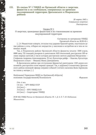Из сводки № 1 УНКВД по Орловской области о зверствах фашистов и их сообщников, совершенных на временно оккупированной территории Дросковского и Покровского районов. 20 марта 1943 г. // ОСФ ИЦ УМВД России по Орловской области. Ф. 1. Д. 4. Л. 7-10. Подлинник. Машинопись.
