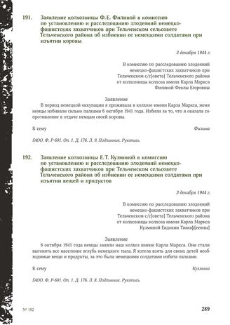 Заявление колхозницы Е.Т. Кузминой в комиссию по установлению и расследованию злодеяний немецко-фашистских захватчиков при Тельченском сельсовете Тельченского района об избиении ее немецкими солдатами при изъятии вещей и продуктов. 3 декабря 1944 г. // ГАОО. Ф. P-691. Оп. 1. Д. 176. Л. 8. Подлинник. Рукопись.