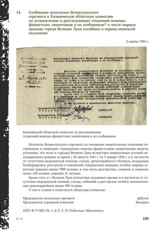 Сообщение исполкома Великолукского горсовета в Калининскую областную комиссию по установлению и расследованию злодеяний немецко-фашистских захватчиков и их сообщников о числе мирных граждан города Великие Луки погибших в период немецкой оккупации. 2 марта 1944 г. // ГАТО. Ф. P-1925. Оп. 1. Д. 8. Л. 19. Подлинник. Машинопись.