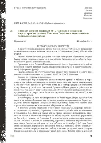 Протокол допроса свидетеля М.П. Ивановой о сожжении мирных граждан деревни Пикалихи Пикалихинского сельсовета Карамышевского района. Карамышево, 25 ноября 1944 г.