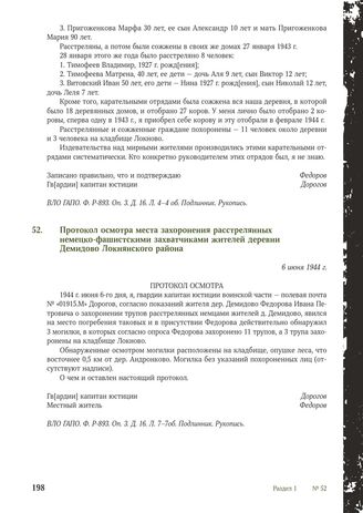 Протокол осмотра места захоронения расстрелянных немецко-фашистскими захватчиками жителей деревни Демидово Локнянского района. 6 июня 1944 г.