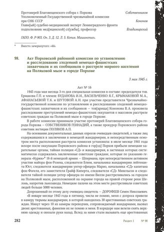 Акт Порховской районной комиссии по установлению и расследованию злодеяний немецко-фашистских захватчиков и их сообщников о расстреле мирного населения на Поляковой мызе в городе Порхове. 3 мая 1945 г.