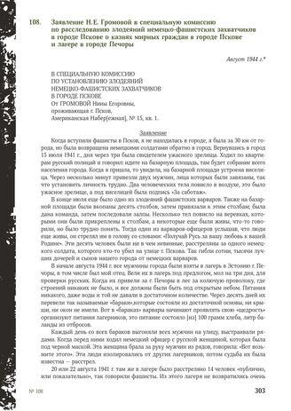 Заявление Н.Е. Громовой в специальную комиссию по расследованию злодеяний немецко-фашистских захватчиков в городе Пскове о казнях мирных граждан в городе Пскове и лагере в городе Печоры. Август 1944 г. // ГАПО. Ф. P-903. Оп. 3. Д. 1. Л. 32-33. Копия. Машинопись.