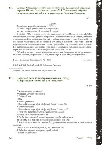 Справка Славковского районного отдела НКГБ, выданная уроженке деревни Юрино Славковского района М.Г. Тимофеевой, об угоне на принудительную работу на территорию Латвии и Германии. 1945 г.