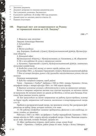 Опросный лист для возвратившихся на Родину из германской неволи на А. И. Линдову. 1946 г. // ВЛО ГАПО. Ф. P-1691. Оп. 1. Д. 1451. Л. 165-166 об. Подлинник. Заполненный от руки типографский бланк.