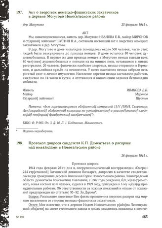 Протокол допроса свидетеля К.П. Дементьева о расправе над инвалидами в Новосельском районе. 26 февраля 1944 г.