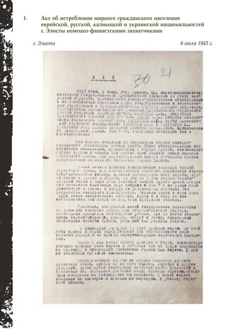 Акт об истреблении мирного гражданского населения еврейской, русской, калмыцкой и украинской национальностей г. Элисты немецко-фашистскими захватчиками. г. Элиста, 6 июля 1943 г. // НАРК. Ф. P-68. Oп. 1. Д. 5. Л. 21-23. Копия. Машинопись.